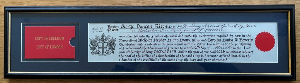Having worked in the City of London for 25 years, I was honoured on retirement by the members of my team sponsoring me to take the Freedom of the City. My application was submitted to, and approved by, the Court of Common Council of the City, in October 2022, and finally, in the last week of March I was able to appear before the Chamberlain’s Court in London’s Guildhall for the Freedom Ceremony. I was brought to the bar and introduced to the Chamberlain by the Beadle, following which I took the Declaration of a Freeman before the Chamberlain and then signed my name in the Freeman’s Declaration Book.