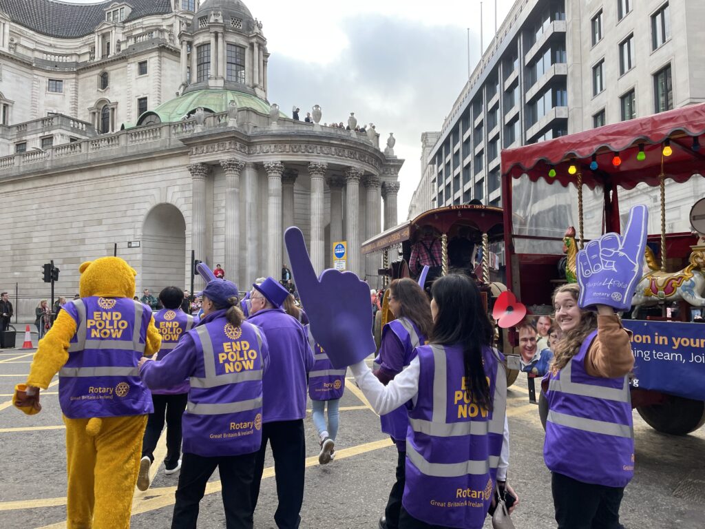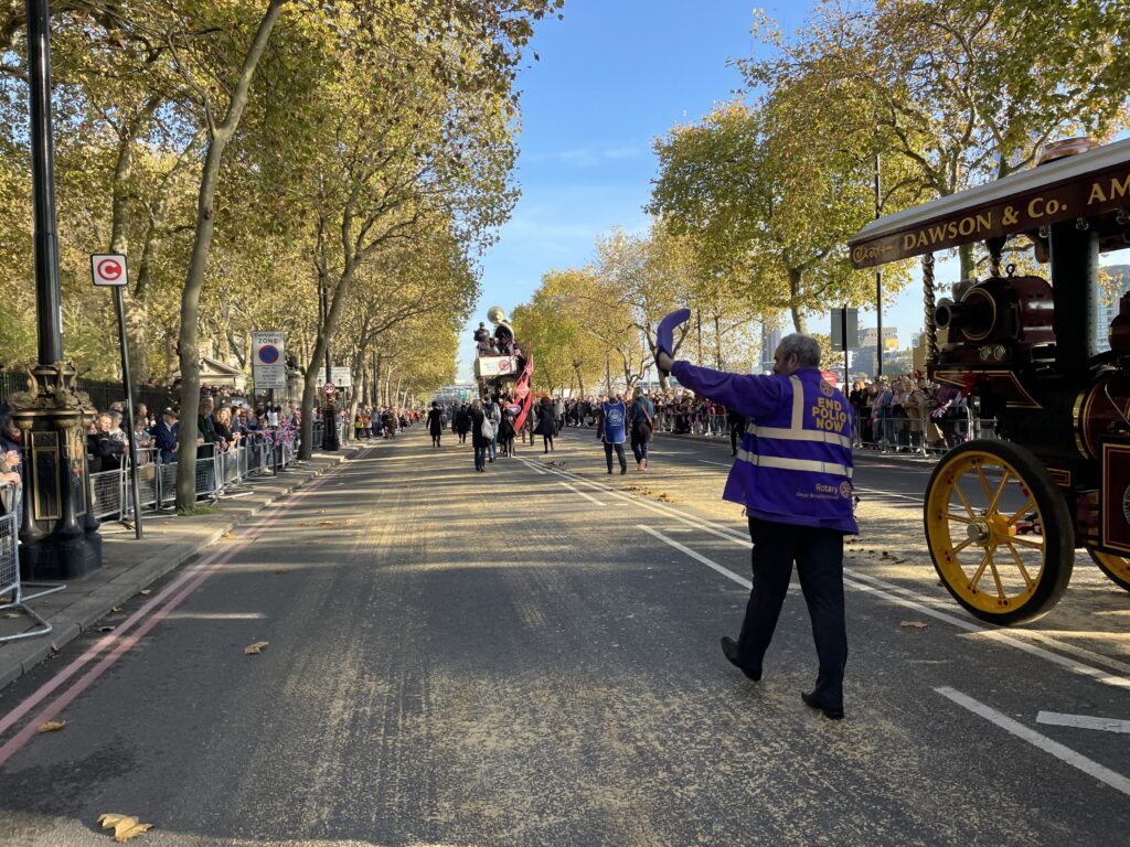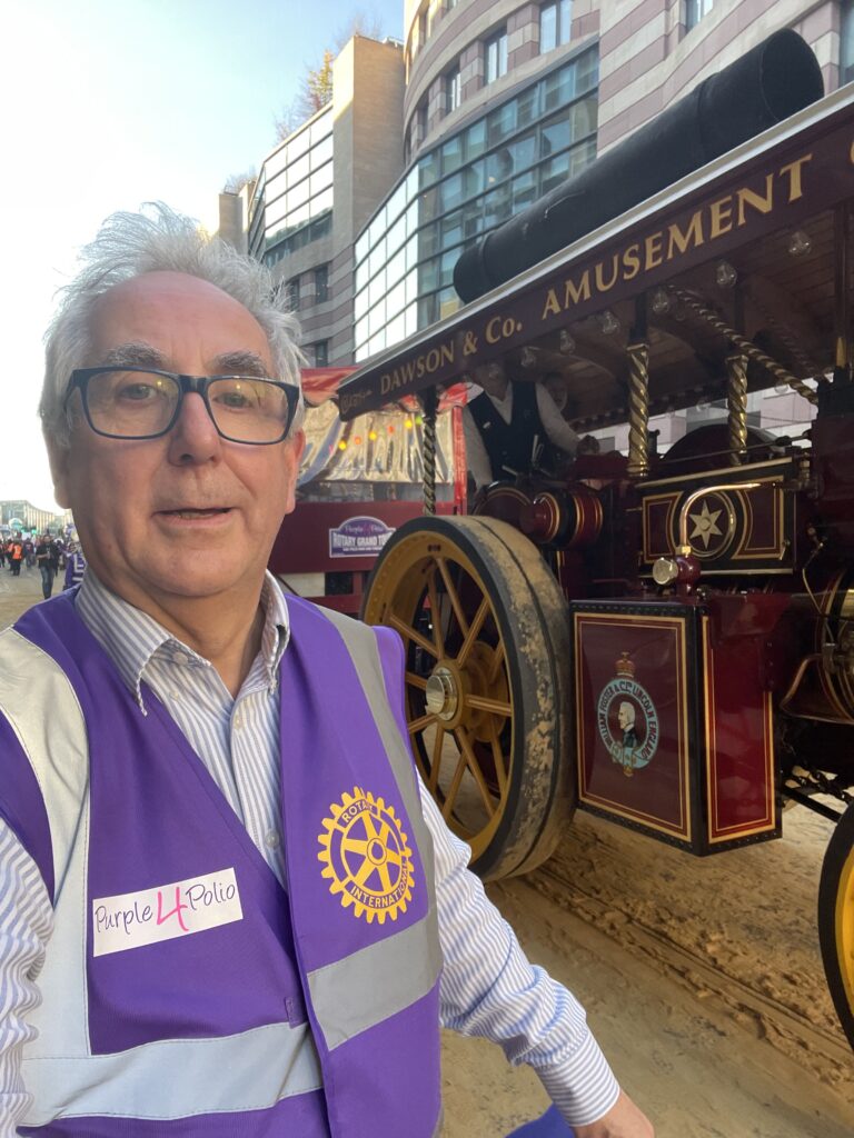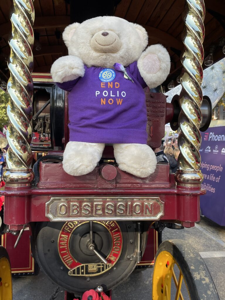 This year, it was a beautiful sunny day, and crowds lined the streets the entire length of the route. The BBC television cameras were present at five points along the route giving the event nationwide coverage. The fascination of a living traction engine, puffing smoke and chugging away, coupled with the magic of the music of the fairground organ meant ours was a float that got plenty of attention and photos – I can’t guess how many pictures were taken of our float – and of our End Polio Now message. It was one of those days when it genuinely felt good to be a Rotarian.