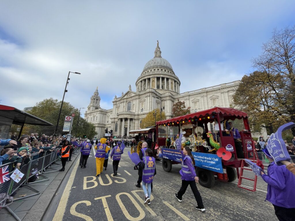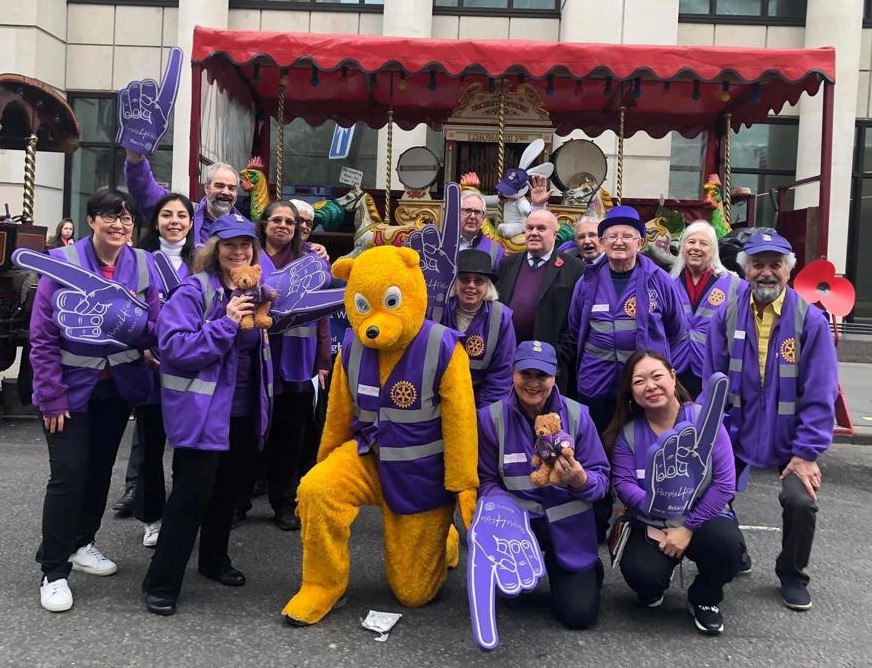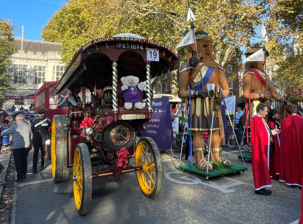 Rotary in London participates in the show (held on the second Saturday of November) to raise awareness of Rotary’s End Polio Now campaign. Our float consists of a wonderful traction machine, a threshing engine built in 1915, pulling a trailer with a magnificent fairground organ on board. The procession starts mid-morning from Mansion House, the home and office of the Lord Mayor.
